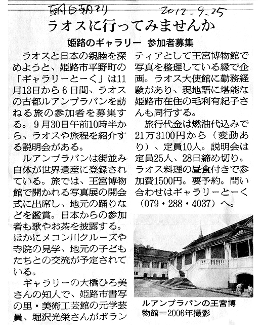 朝日新聞 日本とラオス 文化交流の旅 ’12.11.13(火)~11.18(日)の記事