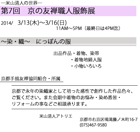 米山清人の世界─第7回 京の友禅職人服飾展 2014/3/13(木)~3/16(日) 11AM~5PM(最終日4PM迄)