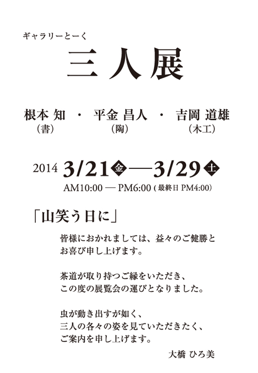 山笑う日に 三人展 2014/3/21(金)~3/29(土) 10AM~6PM(最終日4PM)