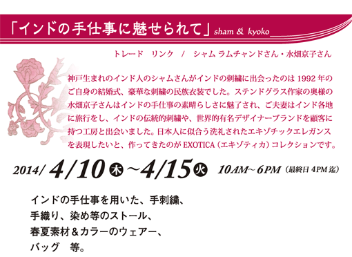 「インドの手仕事に魅せられて」 2014/4/10(木)~4/15(火) 10AM~6PM(最終日4PM)