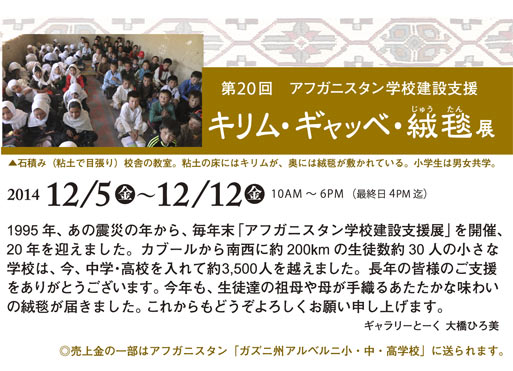 第20回アフガニスタン学校建設支援 キリム・ギャッベ・絨毯展 2014/12/5(金)~12/12(金) 10AM~6PM(最終日4PM迄)