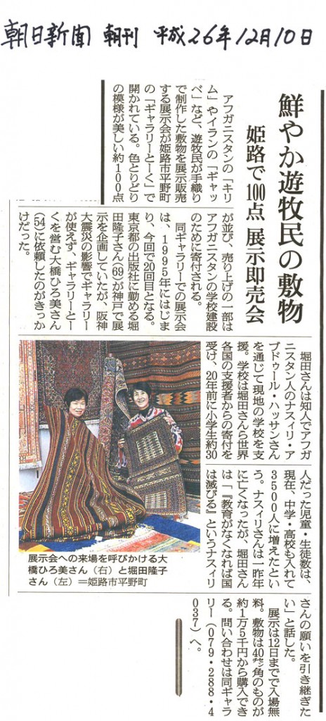 2014.12.10(水)朝日新聞朝刊 アフガニスタン学校建設支援展記事