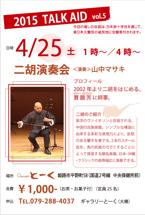 TALK AID 二胡演奏会 2015/4/25(土)13:00~・16:00~ 参加費1000円