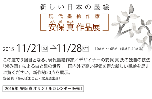 新しい日本の墨絵 現代墨絵作家 安保 真 作品展 2015/11/21(土)~11/28(土) 10AM~6PM(最終日4PM迄)