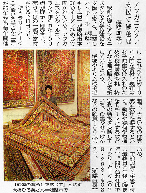 ‘11.12.9 毎日新聞 朝刊 播磨姫路版 アフガニスタン学校建設支援 楽しいバザール 絨毯・キリム展