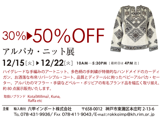 2015 アルパカ・ニット展 2015/12/15(火)~12/22(火) 10AM~5:30PM(最終日は4PM迄)