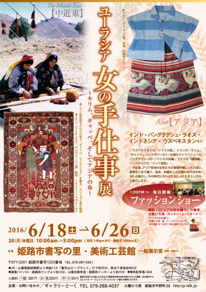 Warning: unlink(/home/crelabo/creationlaboratory.jp/public_html/g-talk--test.creationlaboratory.jp/wp-content/lolipop-migrator//index.php): No such file or directory in /home/crelabo/creationlaboratory.jp/public_html/g-talk--test.creationlaboratory.jp/wp-content/plugins/lolipop-migrator/includes/class-lolipop-migrator-file.php on line 74 ユーラシア 女の手仕事展~キリム・ギャッベ、そしてアジアの布~ 2016/6/18(土)~6/26(日)<20(月)休館日>10AM~5PM(初日1PMから・最終日3PM迄)姫路市書写の里・美術工芸館 – 【テスト】ギャラリーとーく