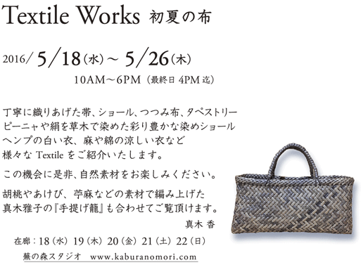 真木 香 Textile Works 初夏の布 2016/5/18(水)~5/26(木) 10AM~6PM(最終日4PM迄)