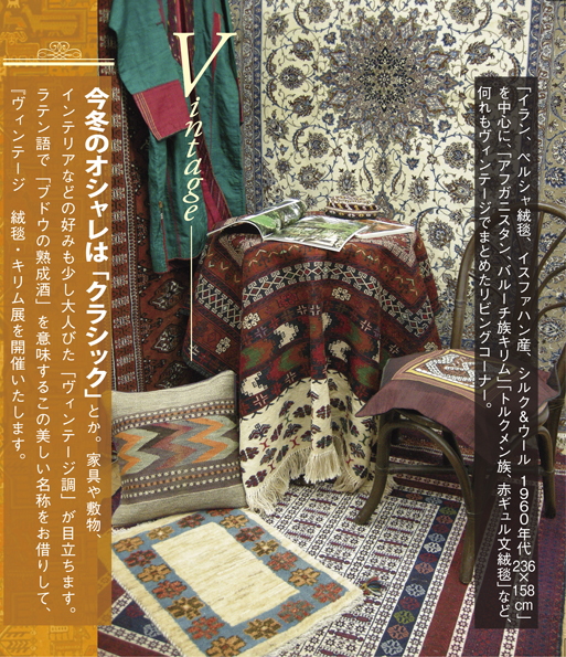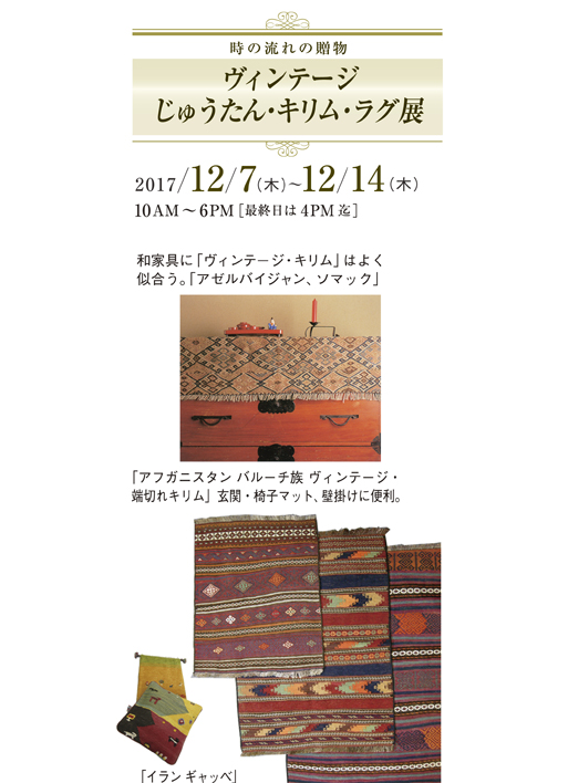 ヴィンテージ じゅうたん・キリム・ラグ展 2017/12/7(木)~12/14(木)10AM~6PM(最終日は4PMまで)