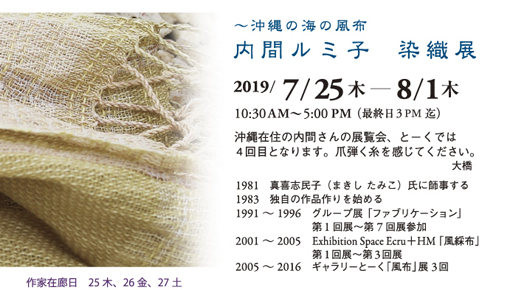 ~沖縄の海の風布 内間ルミ子 染織展 2019/7/25(木)~8/1(木)10:30~17:00(最終日15:00まで)