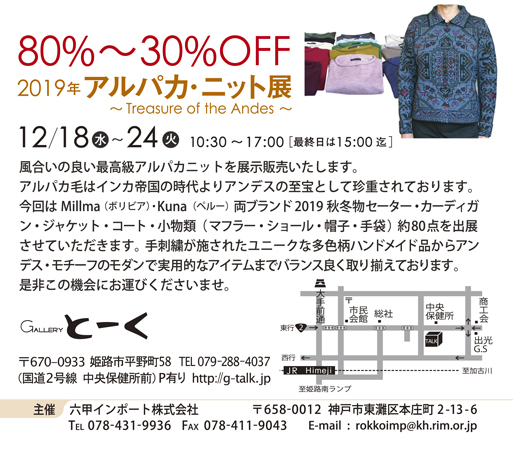 アルパカ・ニット展 2019/12/18(水)~24(火)10:30~17:00(最終日は15:00迄)