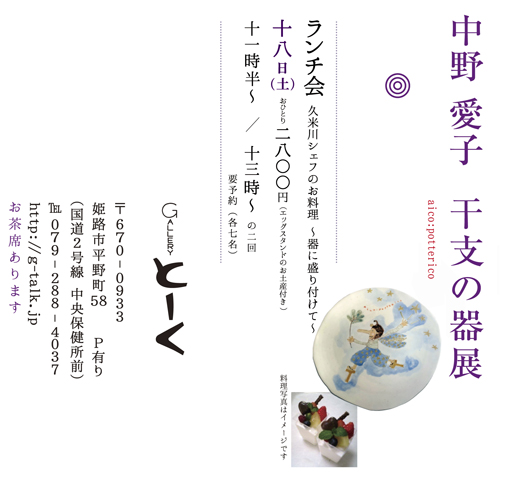 ランチ会 久米川シェフのお料理~中野愛子の器に盛りつけて 2020/1/18(土)2800円 11:30~/13:00~の2回 ※要予約(各7名)