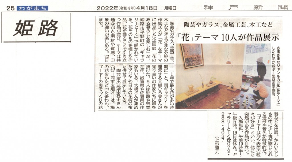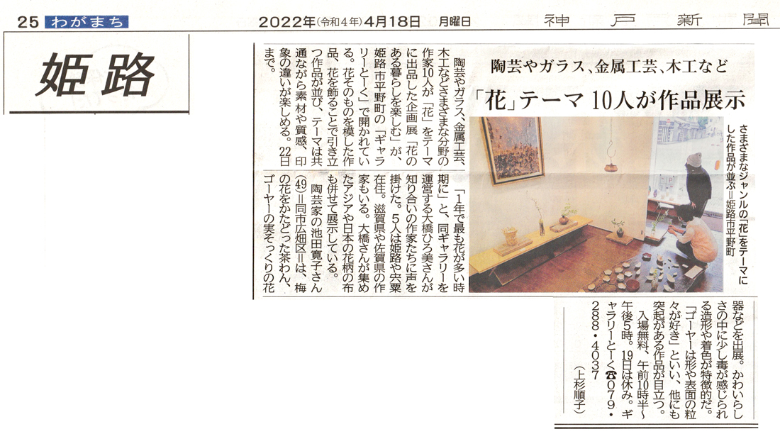 神戸新聞 朝刊 姫路版 2022/4/18(月)花のある暮らしを楽しむ展の記事が掲載されました
