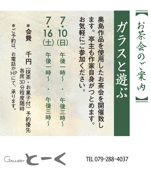 奥島圭二 硝子展 お茶会のご案内 2022/7/10(日)・7/16(土)両日①13:00~ ②15:00~ 会費1000円 予約優先