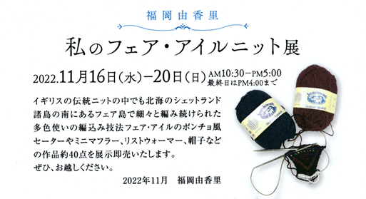 福岡由香里~私のフェア・アイルニット展 2022/11/16(水)~11/20(日)10:30~17:00(最終日16:00まで)