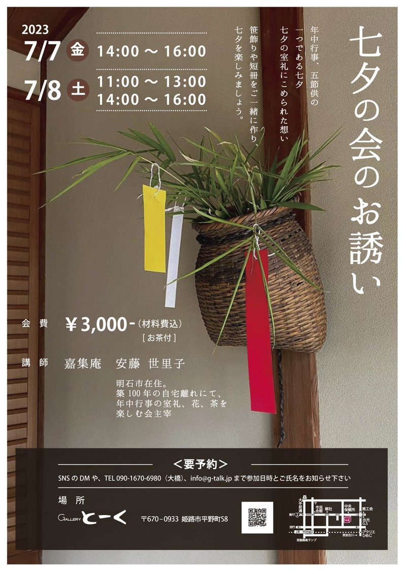 Warning: unlink(/home/crelabo/creationlaboratory.jp/public_html/g-talk--test.creationlaboratory.jp/wp-content/lolipop-migrator//.htaccess): No such file or directory in /home/crelabo/creationlaboratory.jp/public_html/g-talk--test.creationlaboratory.jp/wp-content/plugins/lolipop-migrator/includes/class-lolipop-migrator-file.php on line 47 七夕の会のお誘い 2023/7/7(金)14:00~16:00 ・7/8(土)11:00~13:00/14:00~16:00 会費¥3,000- – 【テスト】ギャラリーとーく