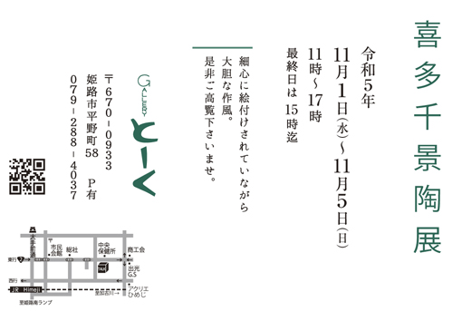 喜多千景 陶展 2023/11/1(水)~11/5(日)11:00~17:00(最終日は15:00まで)