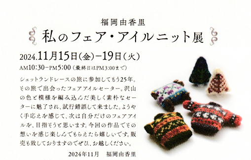 Warning: unlink(/home/crelabo/creationlaboratory.jp/public_html/g-talk--test.creationlaboratory.jp/wp-content/lolipop-migrator//index.php): No such file or directory in /home/crelabo/creationlaboratory.jp/public_html/g-talk--test.creationlaboratory.jp/wp-content/plugins/lolipop-migrator/includes/class-lolipop-migrator-file.php on line 74 福岡由香里 私のフェアアイルニット展 2024/11/15(金)~11/19(火) 10:30~17:00 (最終日15:00まで) – 【テスト】ギャラリーとーく