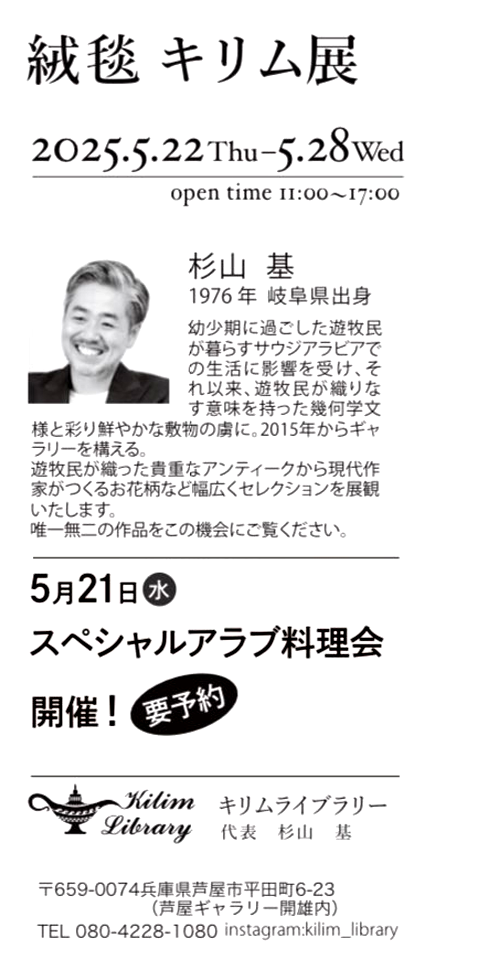 絨毯・キリム展 2025/5/22(木)~5/28(水)11:00~17:00 ・スペシャルアラブ料理会5/21(水)開催(要予約)