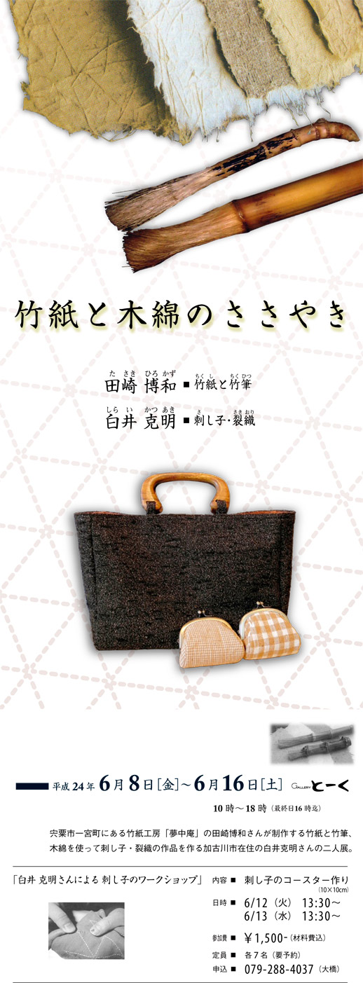 竹紙と木綿のささやき 【田崎博和】竹紙と竹筆/【白井克明】刺し子・裂織 2012/6/8(金)~6/16(土)10AM~6PM(最終日4PM)