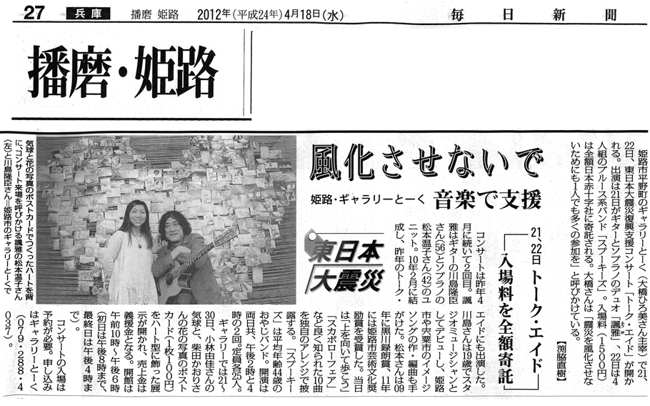 ‘12.4.18 毎日新聞 朝刊 TALK AIDコンサートvol.2の記事