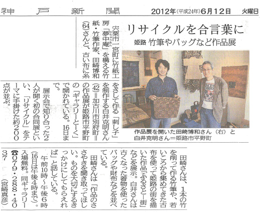 ‘12.6.12 神戸新聞 朝刊 西播版 竹紙と木綿のささやき 記事